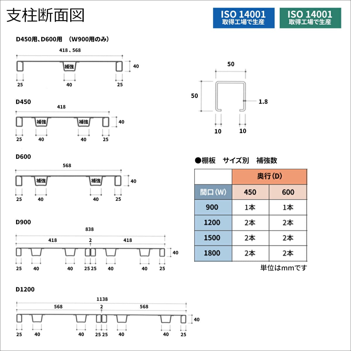 支柱は断面がコの字型のC型チャンネルで堅牢性抜群。上からの荷重はもちろんの事、横からのねじれにも強く、軽量のL型アングルに比べ耐震性が格段に向上します。