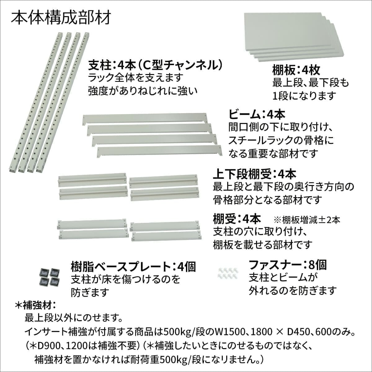 軽量(120kg/段)タイプの1回曲げに対し、5回曲げ加工をし、棚板1段(枚)あたりの静止平均耐荷重500kgを実現しております。又、サイズによっては横幅(W)方向に補強1本~2本を入れ、耐久性、安全性が保証されています。