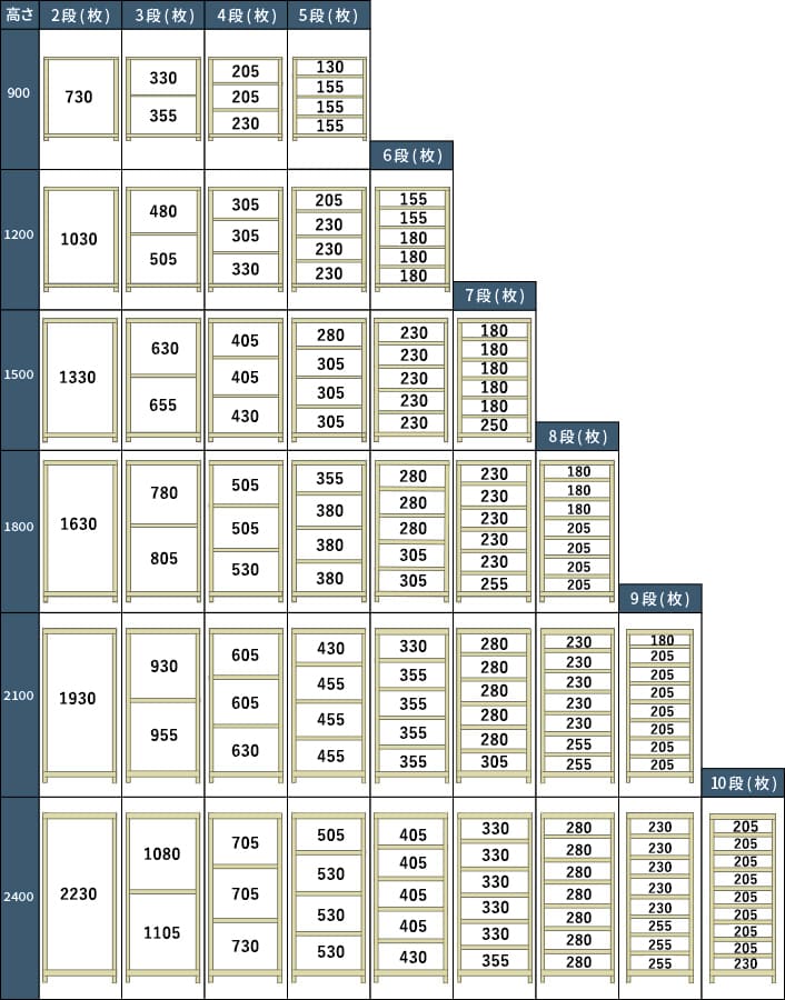 - ・最上部で使用する棚受(小)の取付位置は固定されます。